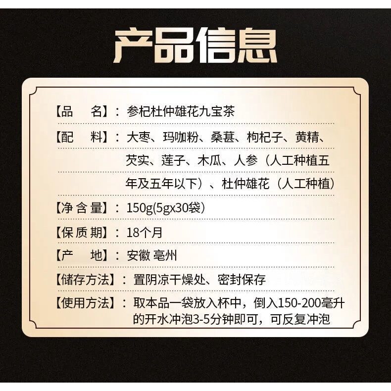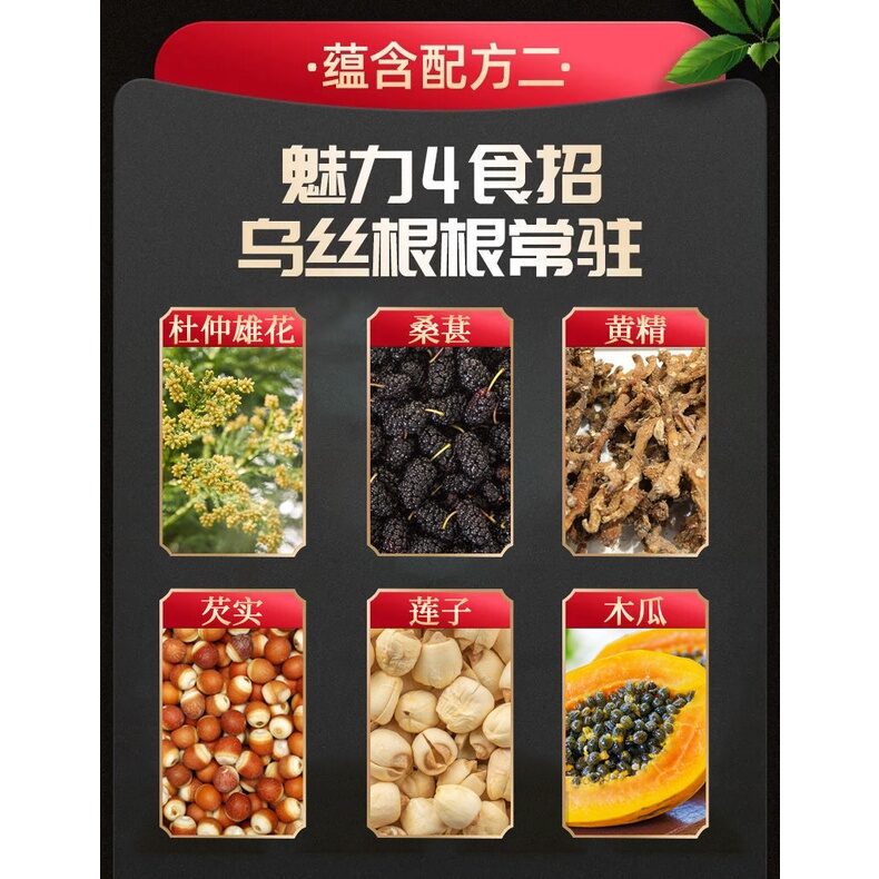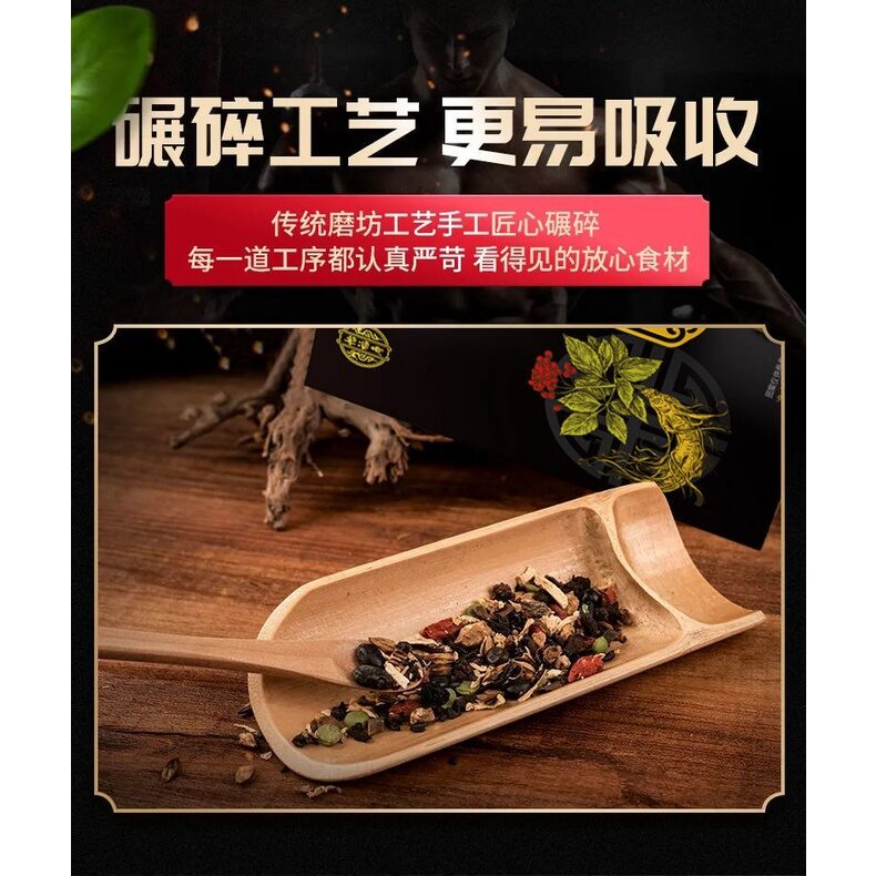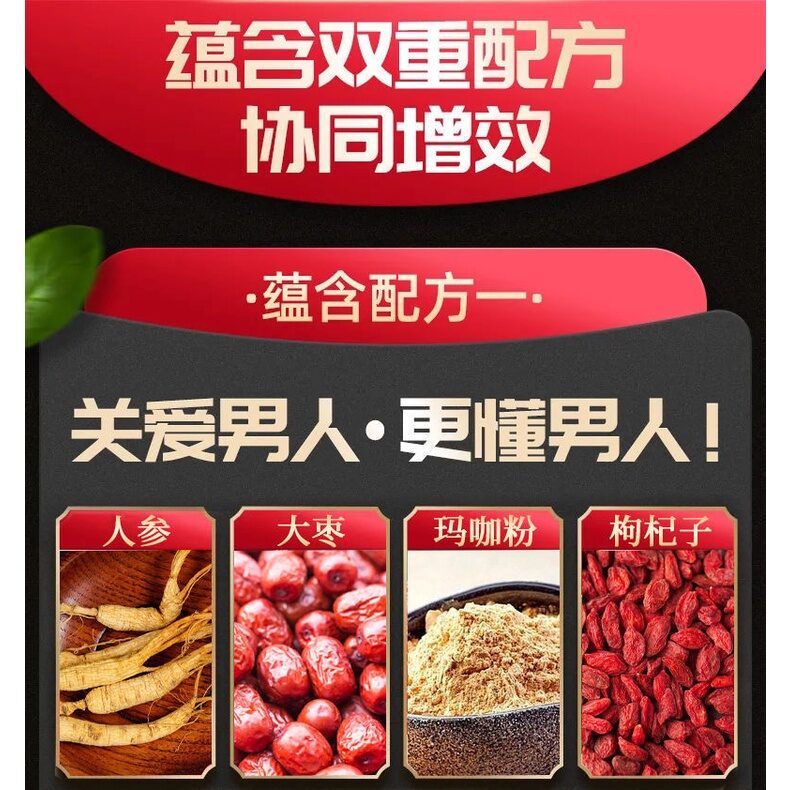 原料与配料:人参 杜仲雄花 玛咖粉 黄精等
