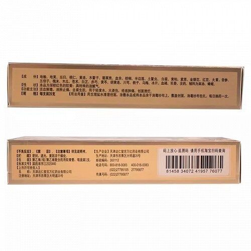 主要原料 地榆、当归、桃仁、紫草、金银花、五倍子、白芷、血竭、木鳖子、冰片、罂粟壳、地黄、黄连、血余炭、棕榈、半边莲、土鳖虫、白蔹、黄柏、红花、大黄、苦参、槐米、木瓜、苍术、赤芍、黄芩、胡黄连、川芎、栀子、乌梅、乳香、没药,辅料为蔗糖,蜂蜡。
