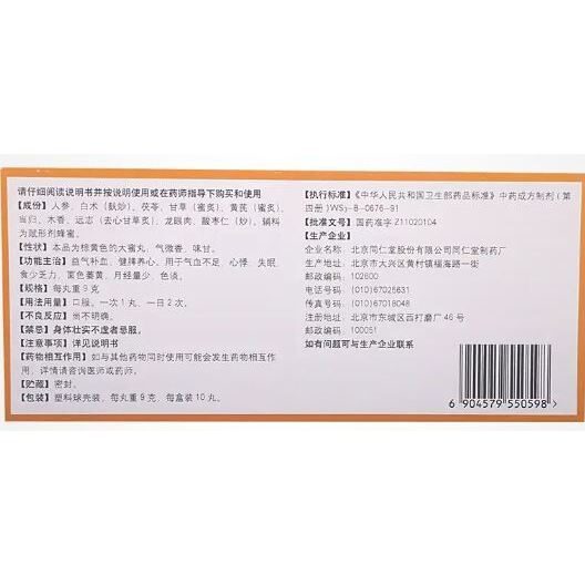成分人参、白术(麸炒)、茯苓、甘草(蜜炙)、黄芪(蜜炙)、当归、木香、远志(去心甘草炙)、龙眼肉、酸枣仁(炒)。辅料为赋形剂蜂蜜。