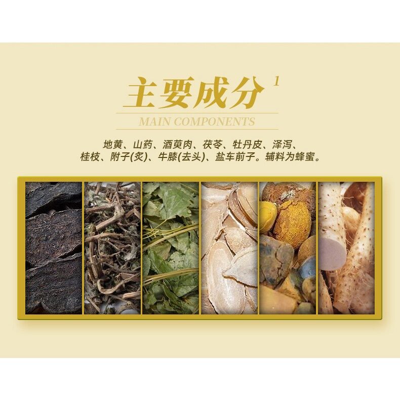 成份:地黄、山药、山茱萸(酒炙)、茯苓、牡丹皮、泽泻、桂枝、附子(炙)、牛膝(去头)、车前子(盐炙)。辅料为蜂蜜。