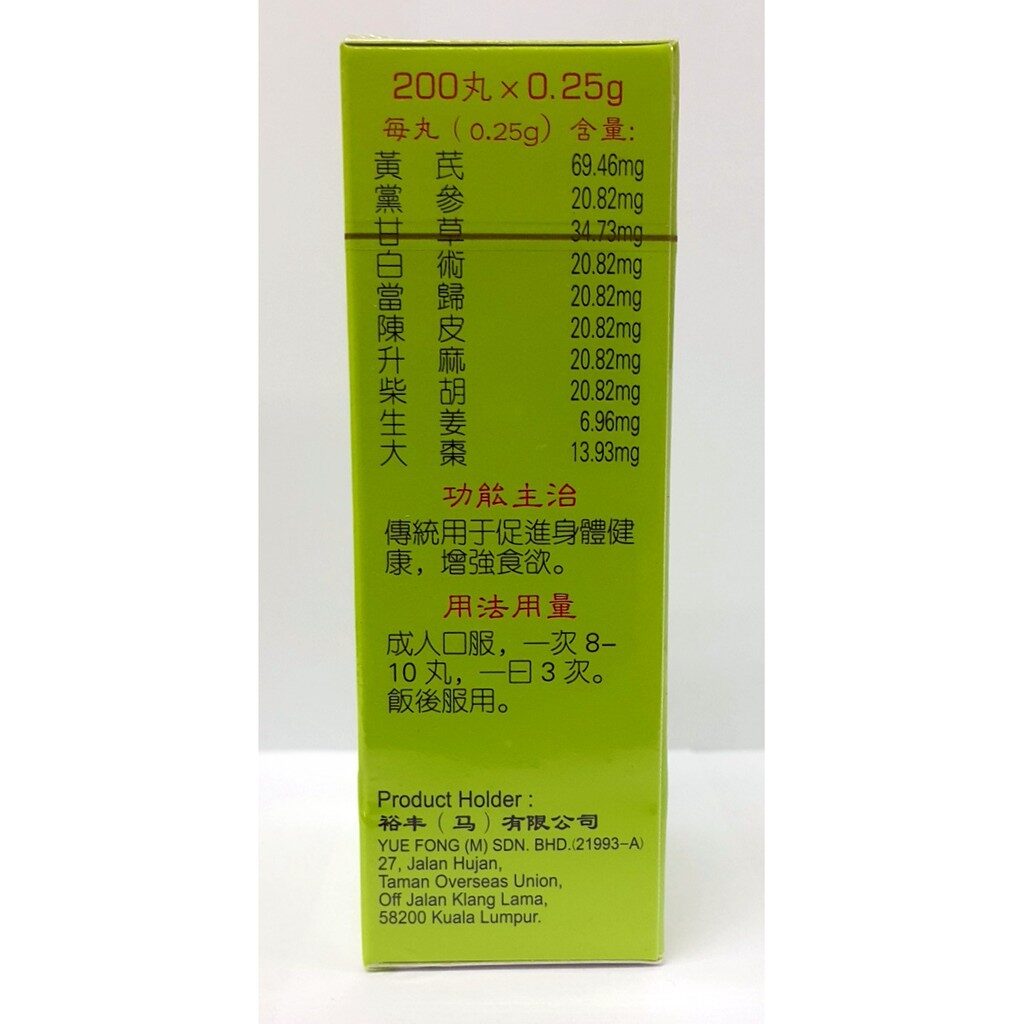 Ingredients (Botanical) Astragalus membranaceus root, Glycyrrhiza uralensis root, Codonopsis pilosula root, Atractylodes macrocephala rhizome, Angelica sinensis root, Cimicifuga heracleifolia rhizome, Bupleurum chinense root, Citrus reticulata peel, Ziziphus jujuba fruit, Zingiber officinale rhizome-fresh