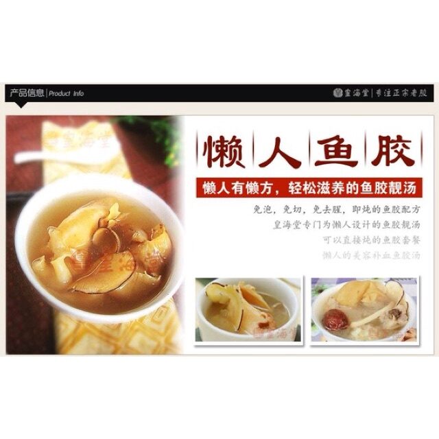 3、由于鱼胶含有大量胶汁,又具有活血、补血、止血、御寒祛湿等功效,所以能提高面利益,对于体质虚弱,真阴亏损、精神过劳的人士,作为进补更为合适。
